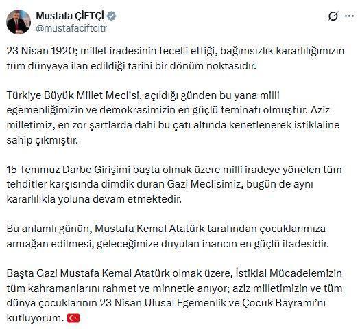Bakan Çiftçi, sanal medya hesabından paylaştığı mesajda, "23 Nisan 1920; millet iradesinin tecelli ettiği, bağımsızlık kararlılığımızın tüm dünyaya ilan edildiği tarihi bir dönüm noktasıdır. Türkiye Büyük Millet Meclisi, açıldığı günden bu yana milli egemenliğimizin ve demokrasimizin en güçlü teminatı olmuştur. Aziz milletimiz, en zor şartlarda dahi bu çatı altında kenetlenerek istiklaline sahip çıkmıştır. 15 Temmuz darbe girişimi başta olmak üzere milli iradeye yönelen tüm tehditler karşısında dimdik duran Gazi Meclisimiz, bugün de aynı kararlılıkla yoluna devam etmektedir. Bu anlamlı günün, Mustafa Kemal Atatürk tarafından çocuklarımıza armağan edilmesi, geleceğimize duyulan inancın en güçlü ifadesidir. Başta Gazi Mustafa Kemal Atatürk olmak üzere, İstiklal Mücadelemizin tüm kahramanlarını rahmet ve minnetle anıyor; aziz milletimizin ve tüm dünya çocuklarının 23 Nisan Ulusal Egemenlik ve Çocuk Bayramı’nı kutluyorum" dedi. (DHA)