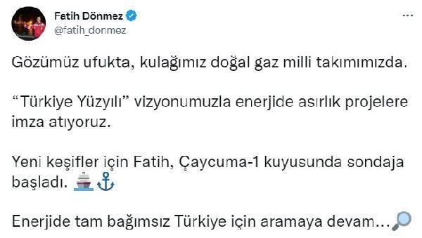 Bakan Dönmez, Twitter'daki hesabından, Türkiye Petrolleri Anonim Ortaklığı'nın Fatih sondaj gemisi ile ilgili açıklamasını paylaşarak, "Gözümüz ufukta, kulağımız doğal gaz milli takımımızda. 'Türkiye Yüzyılı' vizyonumuzla enerjide asırlık projelere imza atıyoruz. Yeni keşifler için Fatih, Çaycuma-1 kuyusunda sondaja başladı. Enerjide tam bağımsız Türkiye için aramaya devam" ifadelerini kullandı. (DHA)