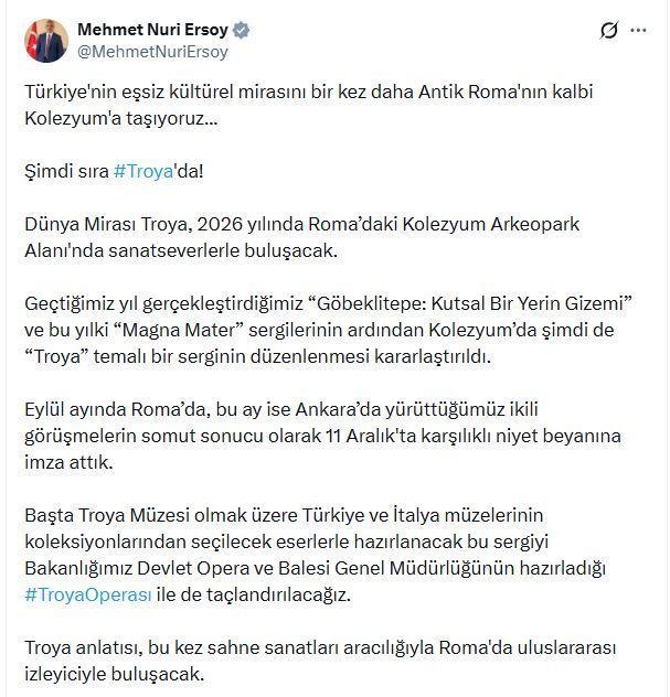 ANKARA, (DHA)- KÜLTÜR ve Turizm Bakanı Mehmet Nuri Ersoy, "Türkiye'nin eşsiz kültürel mirasını bir kez daha Antik Roma'nın kalbi Kolezyum'a taşıyoruz. Dünya mirası Troya, 2026 yılında Roma'daki Kolezyum Arkeopark Alanı'nda sanatseverlerle buluşacak" dedi.