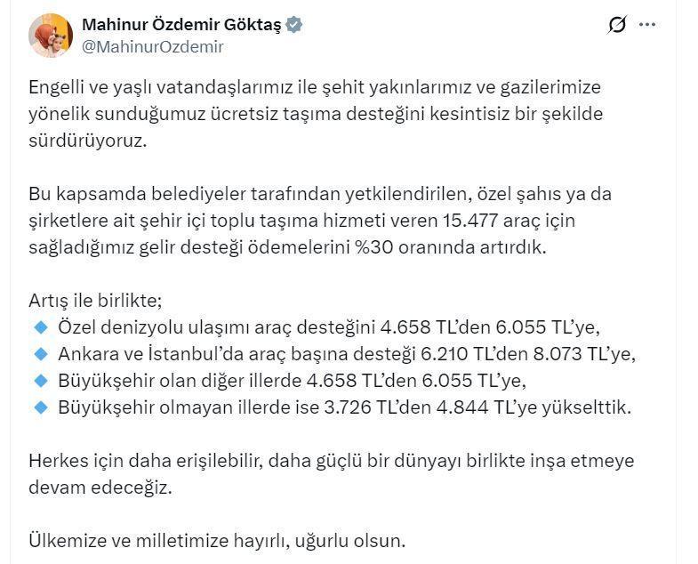 Bakan Göktaş, sanal medya hesabından yaptığı açıklamada, "Engelli ve yaşlı vatandaşlarımız ile şehit yakınlarımız ve gazilerimize yönelik sunduğumuz ücretsiz taşıma desteğini kesintisiz bir şekilde sürdürüyoruz. Bu kapsamda belediyeler tarafından yetkilendirilen, özel şahıs ya da şirketlere ait şehir içi toplu taşıma hizmeti veren 15 bin 477 araç için sağladığımız gelir desteği ödemelerini yüzde 30 oranında artırdık. Artış ile birlikte, özel deniz yolu ulaşımı araç desteğini 4 bin 658 TL'den 6 bin 55 TL'ye, Ankara ve İstanbul'da araç başına desteği 6 bin 210 TL'den 8 bin 73 TL'ye, büyükşehir olan diğer illerde 4 bin 658 TL'den 6 bin 55 TL'ye, büyükşehir olmayan illerde ise 3 bin 726 TL'den 4 bin 844 TL'ye yükselttik. Herkes için daha erişilebilir, daha güçlü bir dünyayı birlikte inşa etmeye devam edeceğiz. Ülkemize ve milletimize hayırlı, uğurlu olsun" ifadelerini kullandı. (DHA)