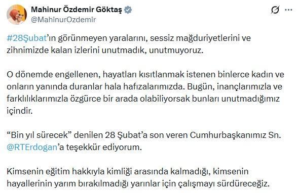 Bakan Göktaş, sanal medya hesabından yaptığı paylaşımda, "28 Şubat’ın görünmeyen yaralarını, sessiz mağduriyetlerini ve zihnimizde kalan izlerini unutmadık, unutmuyoruz. O dönemde engellenen, hayatları kısıtlanmak istenen binlerce kadın ve onların yanında duranlar hala hafızalarımızda. Bugün, inançlarımızla ve farklılıklarımızla özgürce bir arada olabiliyorsak bunları unutmadığımız içindir. ‘Bin yıl sürecek’ denilen 28 Şubat’a son veren Cumhurbaşkanımız Sayın Recep Tayyip Erdoğan’a teşekkür ediyorum. Kimsenin eğitim hakkıyla kimliği arasında kalmadığı, kimsenin hayallerinin yarım bırakılmadığı yarınlar için çalışmayı sürdüreceğiz” ifadelerini kullandı. (DHA)