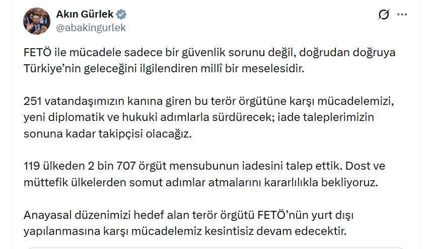 Adalet Bakanı Akın Gürlek, sanal medya hesabından yaptığı açıklamada, "FETÖ ile mücadele sadece bir güvenlik sorunu değil, doğrudan doğruya Türkiye'nin geleceğini ilgilendiren milli bir meselesidir. 251 vatandaşımızın kanına giren bu terör örgütüne karşı mücadelemizi, yeni diplomatik ve hukuki adımlarla sürdürecek; iade taleplerimizin sonuna kadar takipçisi olacağız. 119 ülkeden 2 bin 707 örgüt mensubunun iadesini talep ettik. Dost ve müttefik ülkelerden somut adımlar atmalarını kararlılıkla bekliyoruz. Anayasal düzenimizi hedef alan terör örgütü FETÖ'nün yurt dışı yapılanmasına karşı mücadelemiz kesintisiz devam edecektir" ifadelerini kullandı. (DHA)