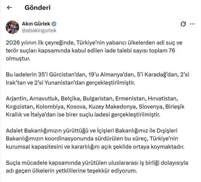 ANKARA, (DHA)- ADALET Bakanı Akın Gürlek, "2026 yılının ilk çeyreğinde, Türkiye’nin yabancı ülkelerden adi suç ve terör suçları kapsamında kabul edilen iade talebi sayısı toplam 76 olmuştur" dedi.