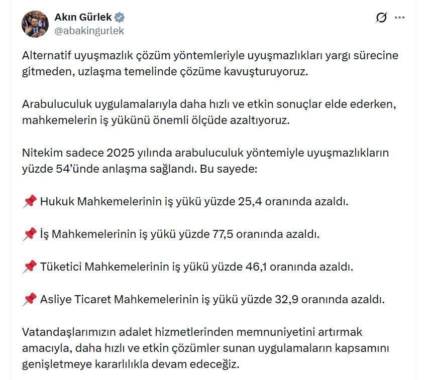 ANKARA, (DHA)- ADALET Bakanı Akın Gürlek, "Arabuluculuk uygulamalarıyla daha hızlı ve etkin sonuçlar elde ederken, mahkemelerin iş yükünü önemli ölçüde azaltıyoruz. Nitekim sadece 2025 yılında arabuluculuk yöntemiyle uyuşmazlıkların yüzde 54'ünde anlaşma sağlandı" dedi.