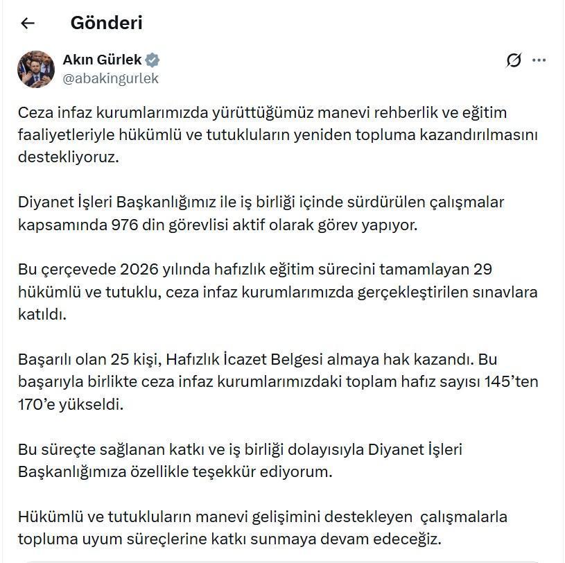 ANKARA, (DHA)- ADALET Bakanı Akın Gürlek, "2026 yılında hafızlık eğitim sürecini tamamlayan 29 hükümlü ve tutuklu, ceza infaz kurumlarımızda gerçekleştirilen sınavlara katıldı. Başarılı olan 25 kişi, Hafızlık İcazet Belgesi almaya hak kazandı. Bu başarıyla birlikte ceza infaz kurumlarımızdaki toplam hafız sayısı 145’ten 170’e yükseldi” dedi.