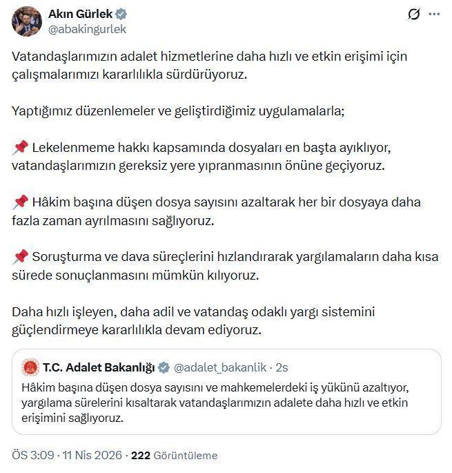 Adalet Bakanı Akın Gürlek, yargının iyileştirilmesi kapsamında yapılan çalışmalara ilişkin sanal medya hesabından açıklama yaptı. Bakan Gürlek, "Vatandaşlarımızın adalet hizmetlerine daha hızlı ve etkin erişimi için çalışmalarımızı kararlılıkla sürdürüyoruz. Yaptığımız düzenlemeler ve geliştirdiğimiz uygulamalarla; lekelenmeme hakkı kapsamında dosyaları en başta ayıklıyor, vatandaşlarımızın gereksiz yere yıpranmasının önüne geçiyoruz. Hakim başına düşen dosya sayısını azaltarak her bir dosyaya daha fazla zaman ayrılmasını sağlıyoruz. Soruşturma ve dava süreçlerini hızlandırarak yargılamaların daha kısa sürede sonuçlanmasını mümkün kılıyoruz. Daha hızlı işleyen, daha adil ve vatandaş odaklı yargı sistemini güçlendirmeye kararlılıkla devam ediyoruz" dedi. (DHA)