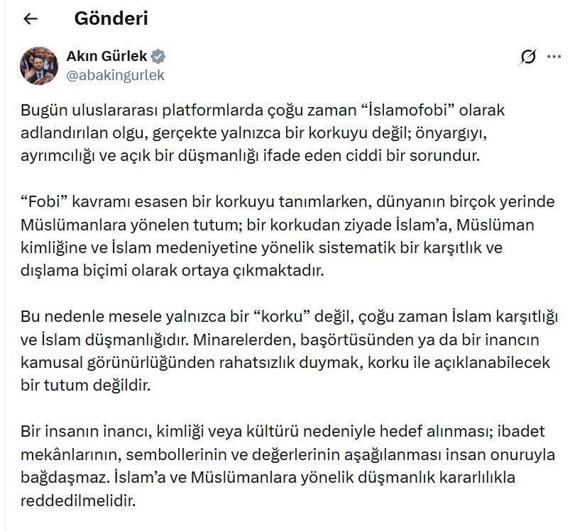 Gürlek, "Minarelerden, başörtüsünden ya da bir inancın kamusal görünürlüğünden rahatsızlık duymak, korku ile açıklanabilecek bir tutum değildir. Bir insanın inancı, kimliği veya kültürü nedeniyle hedef alınması; ibadet mekanlarının, sembollerinin ve değerlerinin aşağılanması insan onuruyla bağdaşmaz. İslam’a ve Müslümanlara yönelik düşmanlık kararlılıkla reddedilmelidir. Toplumların barışını ve ortak geleceğini tehdit eden her türlü ırkçılık ve ayrımcılıkla mücadele etmek, farklılıkları zenginlik olarak gören, insan onurunu ve karşılıklı saygıyı merkeze alan bir anlayışı güçlendirmek hepimizin ortak sorumluluğudur. Türkiye olarak; İslam düşmanlığına, ırkçılığa, yabancı düşmanlığına ve her türlü ayrımcılığa karşı insan onurunu, eşitliği ve hukukun üstünlüğünü savunmaya kararlılıkla devam edeceğiz” ifadelerini kullandı. (DHA)