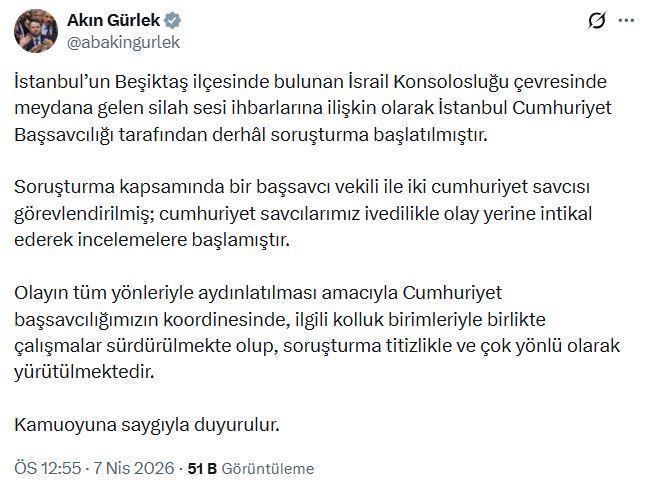 Bakan Gürlek, sanal medya hesabından yaptığı açıklamada, "İstanbul’un Beşiktaş ilçesinde bulunan İsrail Konsolosluğu çevresinde meydana gelen silah sesi ihbarlarına ilişkin olarak İstanbul Cumhuriyet Başsavcılığı tarafından derhal soruşturma başlatılmıştır. Soruşturma kapsamında bir başsavcı vekili ile iki Cumhuriyet savcısı görevlendirilmiş; Cumhuriyet savcılarımız ivedilikle olay yerine intikal ederek incelemelere başlamıştır. Olayın tüm yönleriyle aydınlatılması amacıyla Cumhuriyet başsavcılığımızın koordinesinde, ilgili kolluk birimleriyle birlikte çalışmalar sürdürülmekte olup, soruşturma titizlikle ve çok yönlü olarak yürütülmektedir" ifadelerini kullandı. (DHA)