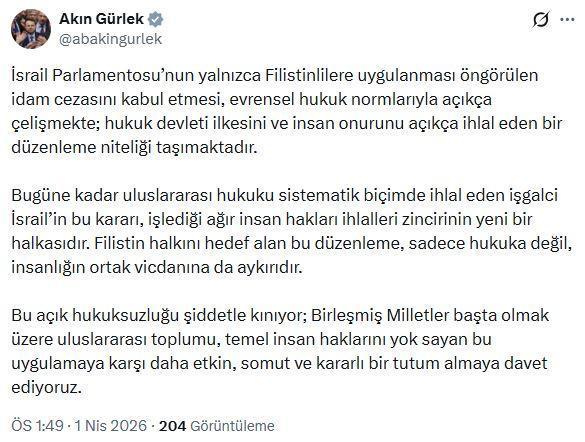 Adalet Bakanı Akın Gürlek, sanal medya hesabından yaptığı açıklamada, "İsrail parlamentosunun yalnızca Filistinlilere uygulanması öngörülen idam cezasını kabul etmesi, evrensel hukuk normlarıyla açıkça çelişmekte; hukuk devleti ilkesini ve insan onurunu açıkça ihlal eden bir düzenleme niteliği taşımaktadır. Bugüne kadar uluslararası hukuku sistematik biçimde ihlal eden işgalci İsrail’in bu kararı, işlediği ağır insan hakları ihlalleri zincirinin yeni bir halkasıdır. Filistin halkını hedef alan bu düzenleme, sadece hukuka değil, insanlığın ortak vicdanına da aykırıdır. Bu açık hukuksuzluğu şiddetle kınıyor; Birleşmiş Milletler başta olmak üzere uluslararası toplumu, temel insan haklarını yok sayan bu uygulamaya karşı daha etkin, somut ve kararlı bir tutum almaya davet ediyoruz" ifadelerini kullandı. (DHA)