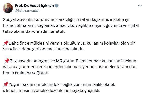 ANKARA, (DHA)- ÇALIŞMA ve Sosyal Güvenlik Bakanı Vedat Işıkhan, "Daha önce müjdesini vermiş olduğumuz; kullanım kolaylığı olan bir SMA ilacı daha geri ödeme listesine alındı" dedi.