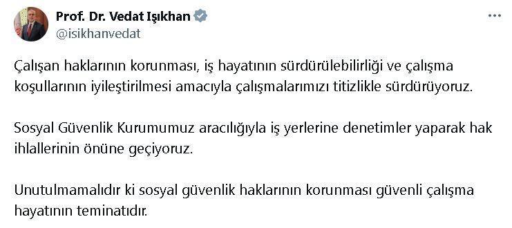 Bakan Vedat Işıkhan, sosyal medya hesabından yaptığı açıklamada, "Çalışan haklarının korunması, iş hayatının sürdürülebilirliği ve çalışma koşullarının iyileştirilmesi amacıyla çalışmalarımızı titizlikle sürdürüyoruz. Sosyal Güvenlik Kurumumuz aracılığıyla iş yerlerine denetimler yaparak hak ihlallerinin önüne geçiyoruz. Unutulmamalıdır ki sosyal güvenlik haklarının korunması güvenli çalışma hayatının teminatıdır" ifadelerini kullandı.