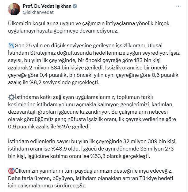 ANKARA, (DHA)- ÇALIŞMA ve Sosyal Güvenlik Bakanı Vedat Işıkhan, "Son 25 yılın en düşük seviyesine gerileyen işsizlik oranı, Ulusal İstihdam Stratejimiz doğrultusunda hedeflerimize uygun seyrediyor" dedi.