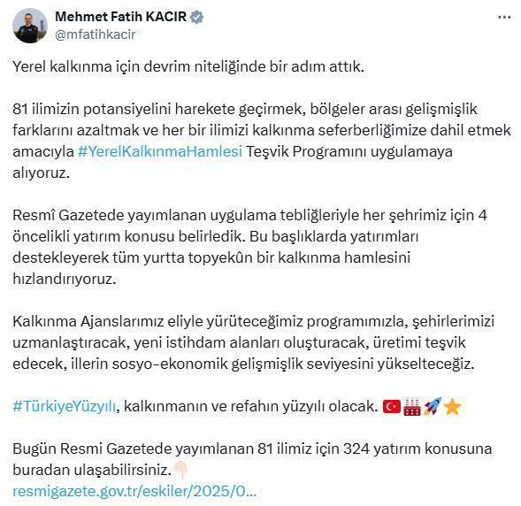 Sanayi ve Teknoloji Bakanı Mehmet Fatih Kacır, sosyal medya hesabından yaptığı açıklamada, "81 ilimizin potansiyelini harekete geçirmek, bölgeler arası gelişmişlik farklarını azaltmak ve her bir ilimizi kalkınma seferberliğimize dahil etmek amacıyla Yerel Kalkınma Hamlesi Teşvik Programı'nı uygulamaya alıyoruz. Resmi Gazete'de yayımlanan uygulama tebliğleriyle her şehrimiz için dört öncelikli yatırım konusu belirledik. Bu başlıklarda yatırımları destekleyerek tüm yurtta topyekun bir kalkınma hamlesini hızlandırıyoruz. Kalkınma Ajanslarımız eliyle yürüteceğimiz programımızla, şehirlerimizi uzmanlaştıracak, yeni istihdam alanları oluşturacak, üretimi teşvik edecek, illerin sosyo-ekonomik gelişmişlik seviyesini yükselteceğiz. 'Türkiye Yüzyılı', kalkınmanın ve refahın yüzyılı olacak" dedi. (DHA)