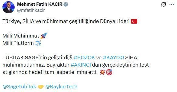 Bakan Kacır, sosyal medya hesabından yaptığı açıklamada, "Türkiye, ve mühimmat çeşitliliğinde dünya lideri. Milli mühimmat ve milli platform. TÜBİTAK SAGE’nin geliştirdiği BOZOK ve KAYI30 SİHA mühimmatlarımız, Bayraktar AKINCI’dan gerçekleştirilen test atışlarında hedefi tam isabetle imha etti” ifadelerini kullandı. (DHA)
