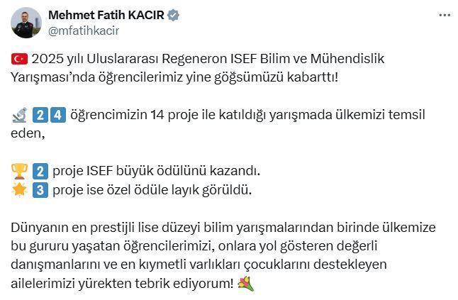 ANKARA, (DHA)- SANAYİ ve Teknoloji Bakanı Mehmet Fatih Kacır, "2025 yılı Uluslararası Regeneron ISEF Bilim ve Mühendislik Yarışması'nda öğrencilerimiz yine göğsümüzü kabarttı. 24 öğrencimizin 14 proje ile katıldığı yarışmada ülkemizi temsil eden 2 proje ISEF büyük ödülünü kazandı" dedi.