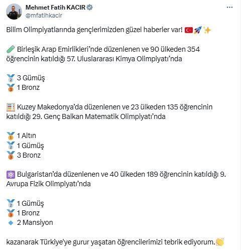 Bakan Kacır, sosyal medya hesabı üzerinden yaptığı paylaşımda, "Bilim olimpiyatlarında gençlerimizden güzel haberlerimiz var. Türkiye'ye gurur yaşatan öğrencilerimizi tebrik ediyorum" dedi. Bakan Kacır'ın paylaştığı görsele göre; Birleşik Arap Emirlikleri’nde düzenlenen ve 90 ülkeden 354 öğrencinin yarıştığı 57'nci Uluslararası Kimya Olimpiyatı’nda Türk öğrenciler; 3 gümüş madalya ve 1 bronz madalya kazandı. Kuzey Makedonya’da düzenlenen ve 23 ülkeden 135 öğrencinin yarıştığı 29'uncu Genç Balkan Matematik Olimpiyatı’nda öğrenciler; 1 altın madalya, 1 gümüş madalya ve 3 bronz madalya aldı. Bulgaristan'da düzenlenen ve 40 ülkeden 189 öğrencinin yarıştığı 9'uncu Avrupa Fizik Olimpiyatı'nda öğrenciler; 1 gümüş madalya, 1 bronz madalya ve 2 mansiyon ödülü kazandı. (DHA)