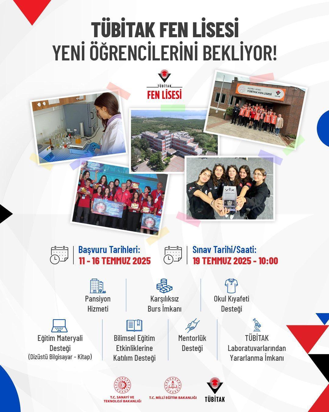 “LGS’de yüzde 1’lik dilimde yer alan öğrencilerimizi TÜBİTAK Fen Lisesi’ne kayıt yaptırmak üzere Merkezi Yetenek Sınavı'na bekliyoruz. TÜBİTAK Fen Lisesi’nde, alanında uzman öğretmen ve akademisyenlerle ileri düzey ve yükselen teknolojiler için gerekli olacak bilgi ve becerilerin kazandırılacağı bilim eğitimi veriliyor. Türkiye’nin en donanımlı uluslararası düzeydeki TÜBİTAK laboratuvarlarını kullanma imkânı, TÜBİTAK Merkez ve Enstitüleri’nde staj imkânı, Hazırlık sınıfından başlamak üzere öğrenim süresince aylık burs, TÜBİTAK Gebze yerleşkesinde konaklama hizmeti, kariyerleri boyunca mentorluk desteği, bilim söyleşileri, kulüp etkinlikleri, spor müsabakaları, teknik geziler ve daha pek çok imkan öğrencilerimize sunuluyor. Milli Eğitim Bakanlığımız ile işbirliği yaparak kurduğumuz TÜBİTAK Fen Lisesi, en yenilikçi uygulamalarla geleceğin bilim insanları ve araştırmacılarını yetiştirmek üzere eğitim dünyamıza değerli katkılar sunuyor.”