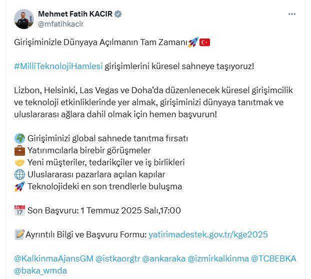 Sanayi ve Teknoloji Bakanı Mehmet Fatih Kacır, sosyal medya hesabından yaptığı açıklamada, "Girişiminizle dünyaya açılmanın tam zamanı. Milli Teknoloji Hamlesi girişimlerini küresel sahneye taşıyoruz. Lizbon, Helsinki, Las Vegas ve Doha'da düzenlenecek küresel girişimcilik ve teknoloji etkinliklerinde yer almak, girişiminizi dünyaya tanıtmak ve uluslararası ağlara dahil olmak için hemen başvurun" ifadelerini kullandı.