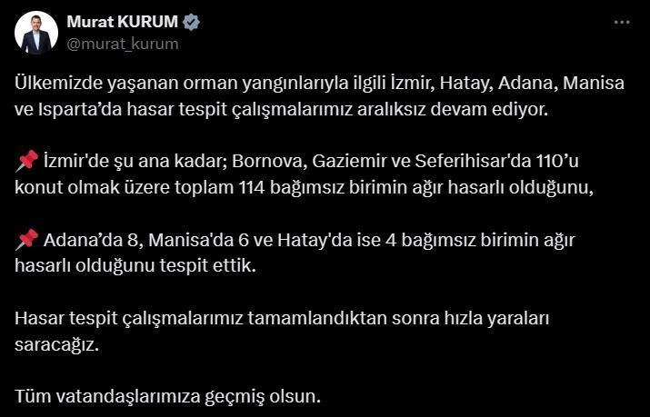 Çevre, Şehircilik ve İklim Değişikliği Bakanı Murat Kurum, sosyal medya hesabından yaptığı açıklamada, "Ülkemizde yaşanan orman yangınlarıyla ilgili İzmir, Hatay, Adana, Manisa ve Isparta'da hasar tespit çalışmalarımız devam ediyor. İzmir'de şu ana kadar; Bornova, Gaziemir ve Seferihisar'da 110'u konut olmak üzere toplam 114 bağımsız birimin ağır hasarlı olduğunu, Adana'da 8, Manisa'da 6 ve Hatay'da ise 4 bağımsız birimin ağır hasarlı olduğunu tespit ettik. Hasar tespit çalışmalarımız tamamlandıktan sonra hızla yaraları saracağız. Tüm vatandaşlarımıza geçmiş olsun" ifadelerini kullandı. (DHA)