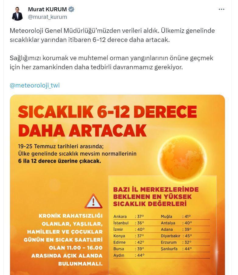 Bakan Murat Kurum, sosyal medya hesabından yaptığı açıklamada, "Meteoroloji Genel Müdürlüğümüzden verileri aldık. Ülkemiz genelinde sıcaklıklar yarından itibaren 6-12 derece daha artacak. Sağlığımızı korumak ve muhtemel orman yangınlarının önüne geçmek için her zamankinden daha tedbirli davranmamız gerekiyor" dedi.