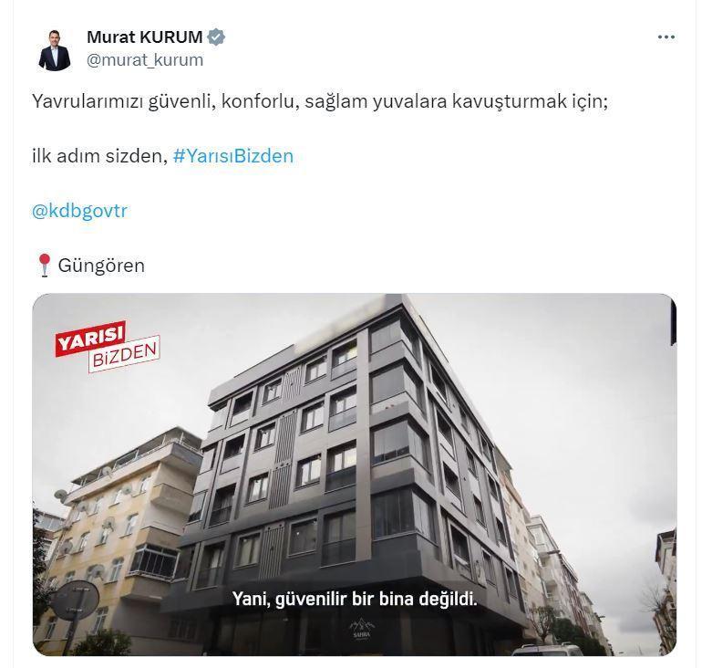 Çevre, Şehircilik ve İklim Değişikliği Bakanlığı'ndan yapılan açıklamaya göre, Kentsel Dönüşüm Başkanlığı'nın İstanbul'da hayata geçirdiği 'Yarısı Bizden' kampanyası ile dönüşüm hızlanıyor. Güngören'de riskli binasını yenilemek isteyen Serçe ailesi de Yarısı Bizden kampanyasıyla evini dönüştürdü. Çevre, Şehircilik ve İklim Değişikliği Bakanı Murat Kurum, Serçe ailesinin görüntülerini sosyal medya hesabından paylaştı. Bakan Kurum, "Yavrularımızı güvenli, konforlu, sağlam yuvalara kavuşturmak için ilk adım sizden, yarısı bizden" ifadelerini kullandı.