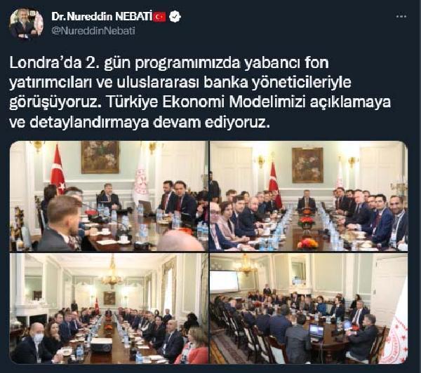 Bakan Nebati, İngilte'nin başkenti Londra'da dün çeşitli bankaların ve yatırımcıların üst düzey yöneticileri ile yaptığı bire bir görüşmelerin ardından bugün de yabancı fon yatırımcıları ve uluslararası banka yöneticileriyle bir araya geldi. Görüşmeye ilişkin fotoğrafları Twitter'daki hesabından paylaşan Bakan Nebati, "Londra’da 2'nci gün programımızda yabancı fon yatırımcıları ve uluslararası banka yöneticileriyle görüşüyoruz. Türkiye Ekonomi Modelimizi açıklamaya ve detaylandırmaya devam ediyoruz" dedi.