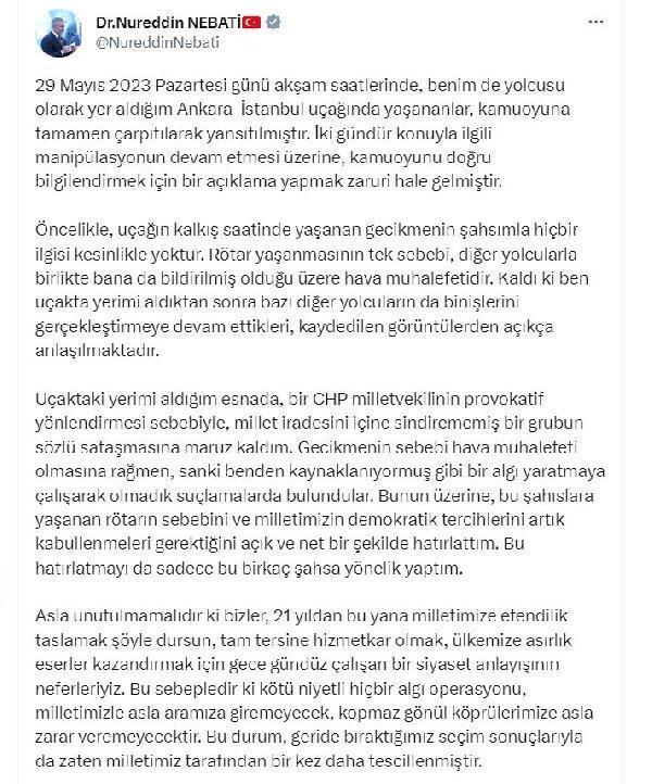 Bakan Nebati, Twitter hesabından yaptığı açıklamada, 29 Mayıs 2023 Pazartesi günü akşam saatlerinde, kendisinin yolcusu olarak yer aldığı Ankara-İstanbul uçağında yaşananların, kamuoyuna tamamen çarpıtılarak yansıtıldığını belirtti. Nebati, "2 gündür konuyla ilgili manipülasyonun devam etmesi üzerine, kamuoyunu doğru bilgilendirmek için bir açıklama yapmak zaruri hale gelmiştir. Öncelikle, uçağın kalkış saatinde yaşanan gecikmenin şahsımla hiçbir ilgisi kesinlikle yoktur. Rötar yaşanmasının tek sebebi, diğer yolcularla birlikte bana da bildirilmiş olduğu üzere hava muhalefetidir. Kaldı ki ben uçakta yerimi aldıktan sonra bazı diğer yolcuların da binişlerini gerçekleştirmeye devam ettikleri, kaydedilen görüntülerden açıkça anlaşılmaktadır" dedi.