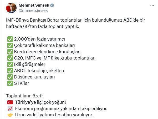 Hazine ve Maliye Bakanı Mehmet Şimşek, sosyal medya hesabından yaptığı açıklamada, IMF-Dünya Bankası Bahar Toplantıları nedeniyle ABD'de bir haftada 60'tan fazla toplantı yaptıklarını belirtti. Bakan Şimşek, 2 binden fazla yatırımcı, çok taraflı kalkınma bankaları, kredi derecelendirme kuruluşları ile görüştüklerini aktardı. G20, IMFC ve IMF ülke grubu toplantılarına katıldıklarını ve ikili görüşmeler gerçekleştirdiklerini kaydeden Şimşek, ABD'li teknoloji şirketleri, düşünce kuruluşları ve sivil toplum kuruluşları ile de bir araya geldiklerini kaydetti.