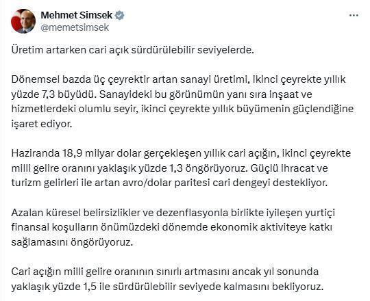 ANKARA, (DHA)- HAZİNE ve Maliye Bakanı Mehmet Şimşek, "Cari açığın milli gelire oranının sınırlı artmasını; ancak yıl sonunda yaklaşık yüzde 1,5 ile sürdürülebilir seviyede kalmasını bekliyoruz" dedi.