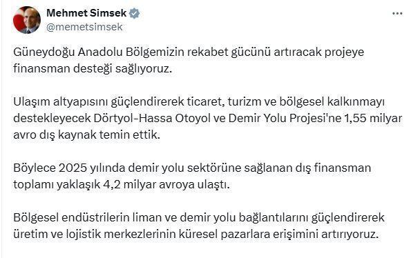 Bakan Şimşek, sosyal medya hesabından yaptığı açıklamada, "Güneydoğu Anadolu Bölgemizin rekabet gücünü artıracak projeye finansman desteği sağlıyoruz. Ulaşım altyapısını güçlendirerek ticaret, turizm ve bölgesel kalkınmayı destekleyecek Dörtyol-Hassa Otoyol ve Demir Yolu Projesi'ne 1,55 milyar avro dış kaynak temin ettik. Böylece 2025 yılında demir yolu sektörüne sağlanan dış finansman toplamı yaklaşık 4,2 milyar avroya ulaştı. Bölgesel endüstrilerin liman ve demir yolu bağlantılarını güçlendirerek üretim ve lojistik merkezlerinin küresel pazarlara erişimini artırıyoruz" ifadelerini kullandı. (DHA)