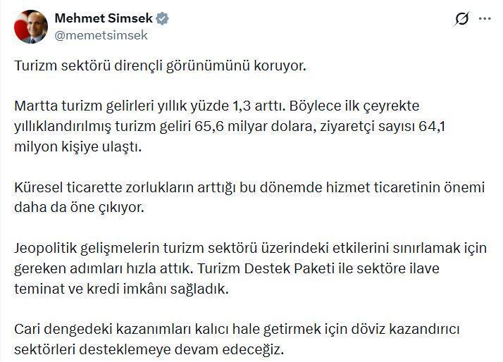 Hazine ve Maliye Bakanı Mehmet Şimşek, sanal medya hesabından yaptığı açıklamada, TÜİK'in açıkladığı turizm istatistiklerini değerlendirdi. Şimşek, "Turizm sektörü dirençli görünümünü koruyor. Martta turizm gelirleri yıllık yüzde 1,3 arttı. Böylece ilk çeyrekte yıllıklandırılmış turizm geliri 65,6 milyar dolara, ziyaretçi sayısı 64,1 milyon kişiye ulaştı. Küresel ticarette zorlukların arttığı bu dönemde hizmet ticaretinin önemi daha da öne çıkıyor. Jeopolitik gelişmelerin turizm sektörü üzerindeki etkilerini sınırlamak için gereken adımları hızla attık. Turizm destek paketi ile sektöre ilave teminat ve kredi imkanı sağladık. Cari dengedeki kazanımları kalıcı hale getirmek için döviz kazandırıcı sektörleri desteklemeye devam edeceğiz" ifadelerini kullandı. (DHA)