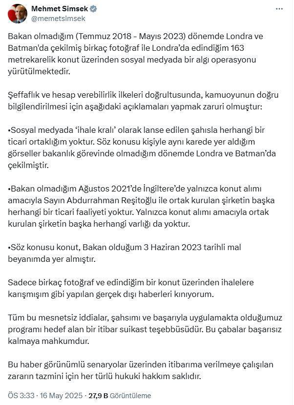 Hazine ve Maliye Bakanı Mehmet Şimşek, sosyal medya hesabından yaptığı açıklamada, "Bakan olmadığım (Temmuz 2018-Mayıs 2023) dönemde Londra ve Batman'da çekilmiş birkaç fotoğraf ile Londra'da edindiğim 163 metrekarelik konut üzerinden sosyal medyada bir algı operasyonu yürütülmektedir. Şeffaflık ve hesap verebilirlik ilkeleri doğrultusunda, kamuoyunun doğru bilgilendirilmesi için aşağıdaki açıklamaları yapmak zaruri olmuştur. Sosyal medyada 'ihale kralı' olarak lanse edilen şahısla herhangi bir ticari ortaklığım yoktur. Söz konusu kişiyle aynı karede yer aldığım görseller bakanlık görevinde olmadığım dönemde Londra ve Batman'da çekilmiştir. Bakan olmadığım Ağustos 2021'de İngiltere'de yalnızca konut alımı amacıyla Sayın Abdurrahman Reşitoğlu ile ortak kurulan şirketin, başka herhangi bir ticari faaliyeti yoktur. Yalnızca konut alımı amacıyla ortak kurulan şirketin başka herhangi varlığı da yoktur. Söz konusu konut, bakan olduğum 3 Haziran 2023 tarihli mal beyanımda yer almıştır" ifadelerini kullandı.