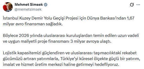 Hazine ve Maliye Bakanı Mehmet Şimşek, sanal medya hesabından yaptığı açıklamada, "İstanbul Kuzey Demir Yolu Geçişi Projesi için Dünya Bankası’ndan 1,67 milyar avro finansman sağladık. Böylece 2026 yılında uluslararası kuruluşlardan temin edilen uzun vadeli ve uygun maliyetli proje finansmanı 3 milyar avroya ulaştı. Lojistik kapasitemizi güçlendiren ve uluslararası taşımacılıktaki rekabet gücümüzü artıran yatırımlarla, Türkiye’yi küresel ölçekte güçlü bir yatırım, imalat ve hizmet üretim merkezi haline getirmeyi hedefliyoruz" ifadelerini kullandı. (DHA)