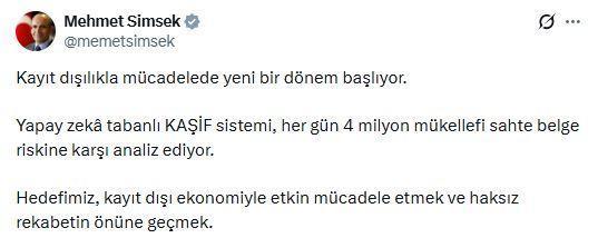 Hazine ve Maliye Bakanı Şimşek, sanal medya hesabından yaptığı açıklamada, "Kayıt dışılıkla mücadelede yeni bir dönem başlıyor. Yapay zeka tabanlı KAŞİF sistemi, her gün 4 milyon mükellefi sahte belge riskine karşı analiz ediyor. Hedefimiz, kayıt dışı ekonomiyle etkin mücadele etmek ve haksız rekabetin önüne geçmek" ifadelerini kullandı. (DHA)