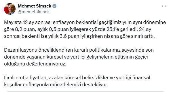 Hazine ve Maliye Bakanı Mehmet Şimşek, piyasa katılımcıları anketi verilerine ilişkin sosyal medya hesabından açıklama yaptı. Bakan Şimşek, "Mayısta 12 ay sonrası enflasyon beklentisi geçtiğimiz yılın aynı dönemine göre 8,2 puan, aylık 0,5 puan iyileşerek yüzde 25,1'e geriledi. 24 ay sonrası beklenti ise yıllık 3,6 puan iyileşirken nisana göre sınırlı arttı. Dezenflasyonu önceliklendiren kararlı politikalarımız sayesinde son dönemde yaşanan küresel ve yurt içi gelişmelerin etkisinin geçici olduğunu değerlendiriyoruz. Ilımlı emtia fiyatları, azalan küresel belirsizlikler ve yurt içi finansal koşullar enflasyonla mücadelemizi destekliyor" ifadelerini kullandı. (DHA)