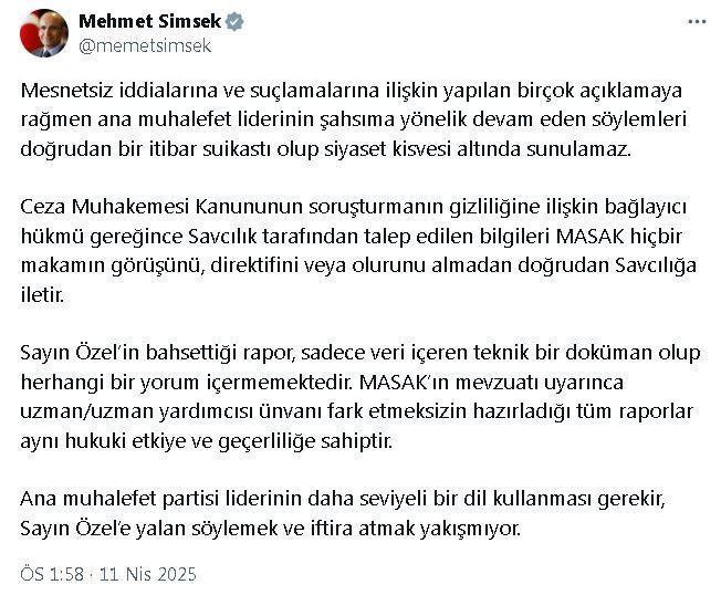 Hazine ve Maliye Bakanı Mehmet Şimşek, CHP Genel Başkanı Özgür Özel'in MASAK raporu iddialarına ilişkin sosyal medya hesabından yaptığı açıklamada, "Mesnetsiz iddialarına ve suçlamalarına ilişkin yapılan birçok açıklamaya rağmen ana muhalefet liderinin şahsıma yönelik devam eden söylemleri doğrudan bir itibar suikastı olup, siyaset kisvesi altında sunulamaz. Ceza Muhakemesi Kanunu'nun soruşturmanın gizliliğine ilişkin bağlayıcı hükmü gereğince savcılık tarafından talep edilen bilgileri MASAK hiçbir makamın görüşünü, direktifini veya olurunu almadan doğrudan savcılığa iletir. Sayın Özel'in bahsettiği rapor, sadece veri içeren teknik bir doküman olup herhangi bir yorum içermemektedir. MASAK'ın mevzuatı uyarınca uzman/uzman yardımcısı unvanı fark etmeksizin hazırladığı tüm raporlar aynı hukuki etkiye ve geçerliliğe sahiptir. Ana muhalefet partisi liderinin daha seviyeli bir dil kullanması gerekir, Sayın Özel'e yalan söylemek ve iftira atmak yakışmıyor" ifadelerini kullandı. (DHA)