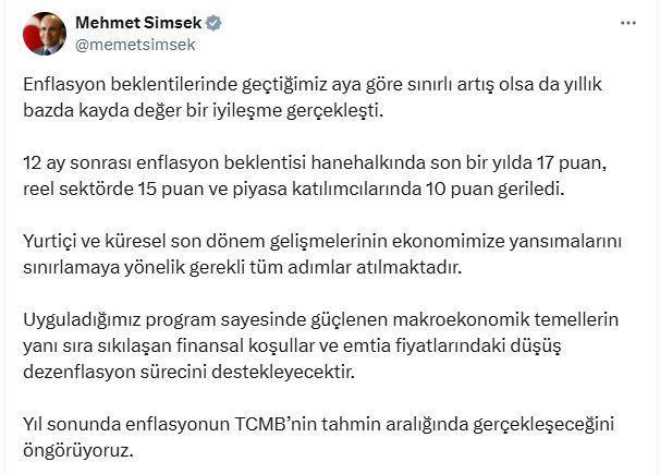 Hazine ve Maliye Bakanı Mehmet Şimşek, sektörel enflasyon beklentilerine ilişkin sosyal medya hesabından yaptığı açıklamada, "Enflasyon beklentilerinde geçtiğimiz aya göre sınırlı artış olsa da yıllık bazda kayda değer bir iyileşme gerçekleşti. 12 ay sonrası enflasyon beklentisi, hanehalkında son bir yılda 17 puan, reel sektörde 15 puan ve piyasa katılımcılarında 10 puan geriledi. Yurt içi ve küresel son dönem gelişmelerinin ekonomimize yansımalarını sınırlamaya yönelik gerekli tüm adımlar atılmaktadır. Uyguladığımız program sayesinde güçlenen makroekonomik temellerin yanı sıra sıkılaşan finansal koşullar ve emtia fiyatlarındaki düşüş dezenflasyon sürecini destekleyecektir. Yıl sonunda enflasyonun, TCMB'nin tahmin aralığında gerçekleşeceğini öngörüyoruz" dedi. (DHA)