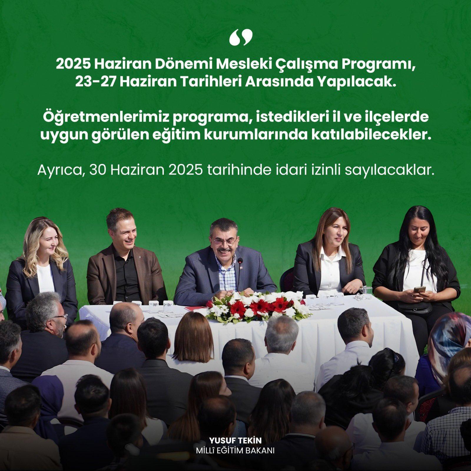 ANKARA, (DHA)- MİLLİ Eğitim Bakanı Yusuf Tekin, 2025 Haziran Dönemi Mesleki Çalışma Programının, 23- 27 Haziran tarihleri arasında yapılacağını duyurdu.