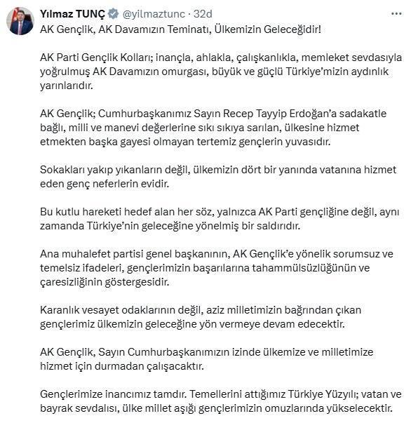 Bakan Tunç, sosyal medya hesabı üzerinden yaptığı açıklamada, "AK Gençlik, AK davamızın teminatı, ülkemizin geleceğidir! AK Parti Gençlik Kolları; inançla, ahlakla, çalışkanlıkla, memleket sevdasıyla yoğrulmuş AK davamızın omurgası, büyük ve güçlü Türkiye’mizin aydınlık yarınlarıdır. AK Gençlik; Cumhurbaşkanımız Sayın Recep Tayyip Erdoğan’a sadakatle bağlı, milli ve manevi değerlerine sıkı sıkıya sarılan, ülkesine hizmet etmekten başka gayesi olmayan tertemiz gençlerin yuvasıdır. Sokakları yakıp yıkanların değil, ülkemizin dört bir yanında vatanına hizmet eden genç neferlerin evidir. Bu kutlu hareketi hedef alan her söz, yalnızca AK Parti gençliğine değil, aynı zamanda Türkiye’nin geleceğine yönelmiş bir saldırıdır. Ana muhalefet partisi genel başkanının, AK Gençlik’e yönelik sorumsuz ve temelsiz ifadeleri, gençlerimizin başarılarına tahammülsüzlüğünün ve çaresizliğinin göstergesidir. Karanlık vesayet odaklarının değil, aziz milletimizin bağrından çıkan gençlerimiz ülkemizin geleceğine yön vermeye devam edecektir. AK Gençlik, Sayın Cumhurbaşkanımızın izinde ülkemize ve milletimize hizmet için durmadan çalışacaktır. Gençlerimize inancımız tamdır. Temellerini attığımız Türkiye Yüzyılı; vatan ve bayrak sevdalısı, ülke millet aşığı gençlerimizin omuzlarında yükselecektir" ifadelerini kullandı. (DHA)