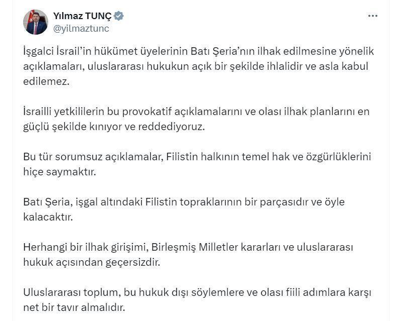 Bakan Tunç, sosyal medya hesabından yaptığı açıklamada, "İşgalci İsrail'in hükümet üyelerinin Batı Şeria'nın ilhak edilmesine yönelik açıklamaları, uluslararası hukukun açık bir şekilde ihlalidir ve asla kabul edilemez. İsrailli yetkililerin bu provokatif açıklamalarını ve olası ilhak planlarını en güçlü şekilde kınıyor ve reddediyoruz. Bu tür sorumsuz açıklamalar, Filistin halkının temel hak ve özgürlüklerini hiçe saymaktır. Batı Şeria, işgal altındaki Filistin topraklarının bir parçasıdır ve öyle kalacaktır. Herhangi bir ilhak girişimi, Birleşmiş Milletler kararları ve uluslararası hukuk açısından geçersizdir. Uluslararası toplum, bu hukuk dışı söylemlere ve olası fiili adımlara karşı net bir tavır almalıdır" dedi. (DHA)