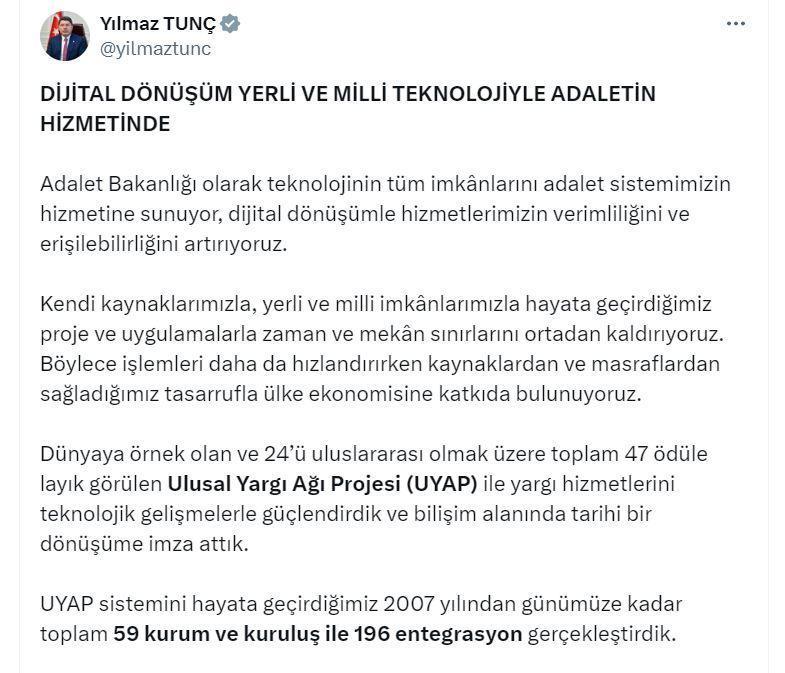 Bakan Tunç, sosyal medya hesabından yaptığı açıklamada, "Adalet Bakanlığı olarak teknolojinin tüm imkanlarını adalet sistemimizin hizmetine sunuyor, dijital dönüşümle hizmetlerimizin verimliliğini ve erişilebilirliğini artırıyoruz. Kendi kaynaklarımızla, yerli ve milli imkanlarımızla hayata geçirdiğimiz proje ve uygulamalarla zaman ve mekan sınırlarını ortadan kaldırıyoruz. Böylece işlemleri daha da hızlandırırken kaynaklardan ve masraflardan sağladığımız tasarrufla ülke ekonomisine katkıda bulunuyoruz. Dünyaya örnek olan ve 24'ü uluslararası olmak üzere toplam 47 ödüle layık görülen Ulusal Yargı Ağı Projesi (UYAP) ile yargı hizmetlerini teknolojik gelişmelerle güçlendirdik ve bilişim alanında tarihi bir dönüşüme imza attık" dedi.