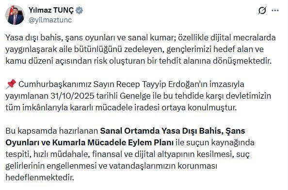 Adalet Bakanı Yılmaz Tunç, yasa dışı bahis, şans oyunu ve sanal kumar suçlarına ilişkin sosyal medya hesabından açıklama yaptı. Bakan Tunç, "Yasa dışı bahis, şans oyunları ve sanal kumar; özellikle dijital mecralarda yaygınlaşarak aile bütünlüğünü zedeleyen, gençlerimizi hedef alan ve kamu düzeni açısından risk oluşturan bir tehdit alanına dönüşmektedir. Cumhurbaşkanımız Sayın Recep Tayyip Erdoğan'ın imzasıyla yayımlanan 31 Ekim 2025 tarihli genelge ile bu tehdide karşı devletimizin tüm imkanlarıyla kararlı mücadele iradesi ortaya konulmuştur. Bu kapsamda hazırlanan Sanal Ortamda Yasa Dışı Bahis, Şans Oyunları ve Kumarla Mücadele Eylem Planı ile suçun kaynağında tespiti, hızlı müdahale, finansal ve dijital altyapının kesilmesi, suç gelirlerinin engellenmesi ve vatandaşlarımızın korunması hedeflenmektedir. Bu suçlarla mücadelede hukuki ve idari altyapının güçlendirilmesi, denetim ve yaptırım mekanizmalarının etkinleştirilmesi ve kurumlar arası koordinasyonun artırılması esas alınarak kamu kurumlarının sorumlulukları da belirlenmiştir" ifadelerini kullandı.