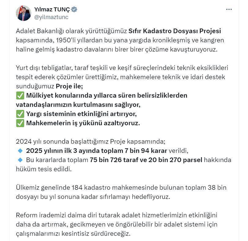 Bakan Tunç, sosyal medya hesabından yaptığı açıklamada, "Adalet Bakanlığı olarak yürüttüğümüz Sıfır Kadastro Dosyası Projesi kapsamında, 1950'li yıllardan bu yana yargıda kronikleşmiş ve kangren haline gelmiş kadastro davalarını birer birer çözüme kavuşturuyoruz. Yurt dışı tebligatlar, taraf teşkili ve keşif süreçlerindeki teknik eksiklikleri tespit ederek çözümler ürettiğimiz, mahkemelere teknik ve idari destek sunduğumuz proje ile mülkiyet konularında yıllarca süren belirsizliklerden vatandaşlarımızın kurtulmasını sağlıyor, yargı sisteminin etkinliğini artırıyor, mahkemelerin iş yükünü azaltıyoruz" ifadelerini kullandı.