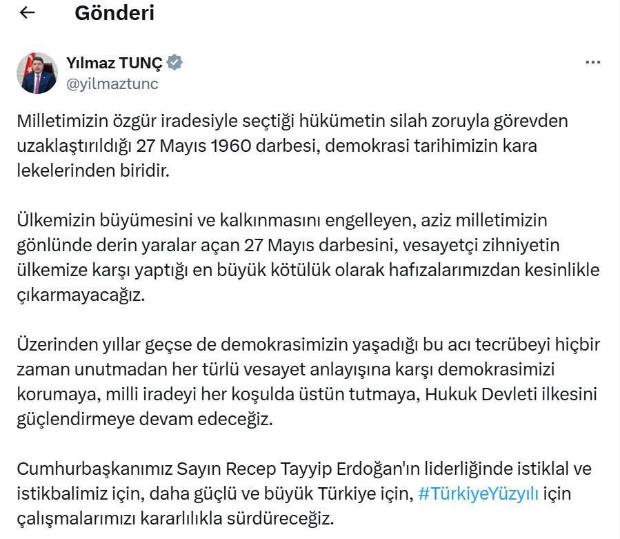 Eda KOÇ/ANKARA, (DHA)- ADALET Bakanı Yılmaz Tunç, 27 Mayıs 1960 darbesinin 65'inci yıl dönümüne ilişkin mesaj paylaştı.