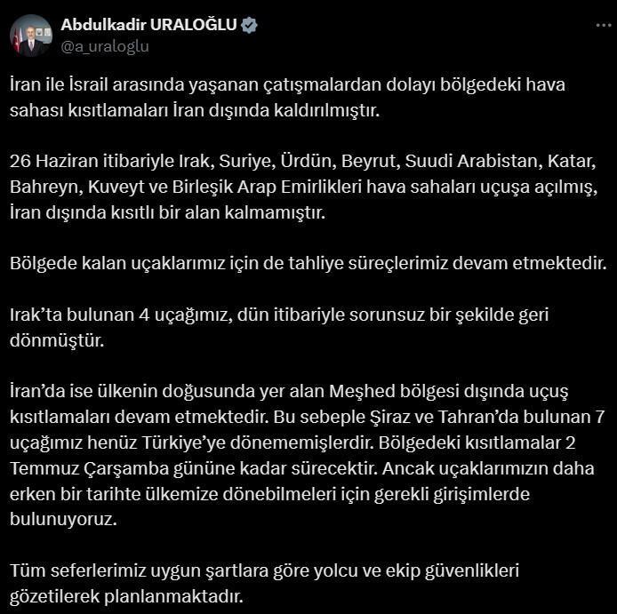 Bakan Uraloğlu, İran ile İsrail arasında yaşanan çatışmalar sonrası hava sahasında yapılan kısıtlamalara ilişkin sosyal medya hesabından açıklama yaptı. Uraloğlu, "İran ile İsrail arasında yaşanan çatışmalardan dolayı bölgedeki hava sahası kısıtlamaları İran dışında kaldırılmıştır. 26 Haziran itibariyle Irak, Suriye, Ürdün, Beyrut, Suudi Arabistan, Katar, Bahreyn, Kuveyt ve Birleşik Arap Emirlikleri hava sahaları uçuşa açılmış, İran dışında kısıtlı bir alan kalmamıştır" dedi.