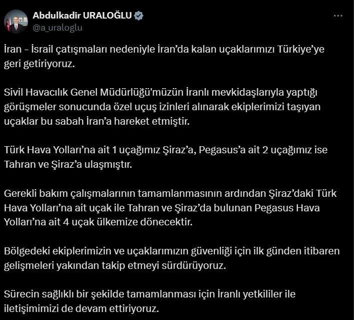 ANKARA, (DHA)- ULAŞTIRMA ve Altyapı Bakanı Abdulkadir Uraloğlu, "İran-İsrail çatışmaları nedeniyle İran’da kalan uçaklarımızı Türkiye’ye geri getiriyoruz. Gerekli bakım çalışmalarının tamamlanmasının ardından Şiraz’daki Türk Hava Yolları’na ait uçak ile Tahran ve Şiraz’da bulunan Pegasus Hava Yolları’na ait 4 uçak ülkemize dönecektir" dedi.