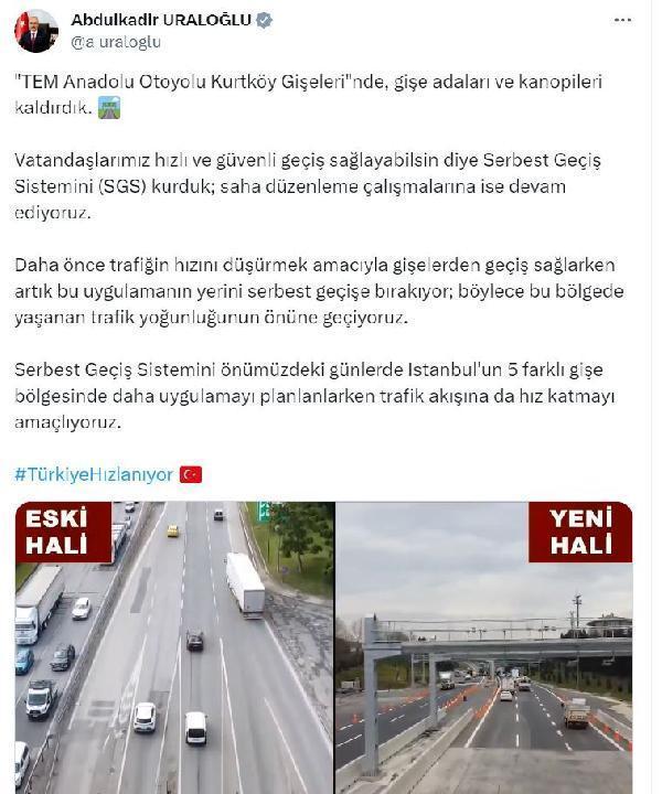 Sevdenur NAMALAN/ANKARA, (DHA)- ULAŞTIRMA ve Altyapı Bakanı Abdulkadir Uraloğlu, TEM Anadolu Otoyolu Kurtköy Gişeleri’nde bulunan gişe adaları ve kanopileri kaldırdıklarını duyurdu.