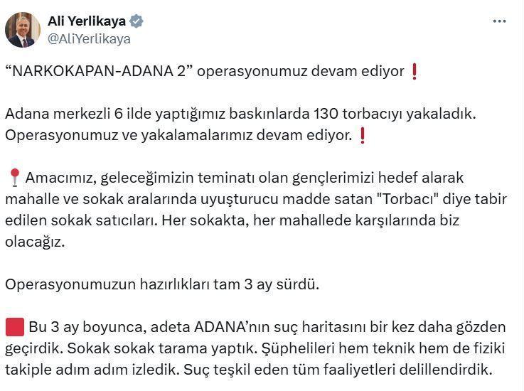 Bakan Yerlikaya'nın sosyal medya hesabından yaptığı açıklamaya göre; Adana merkezli İstanbul, Konya, Adıyaman, Samsun ve Kayseri'de uyuşturucu satıcılarına yönelik 'Narkokapan-Adana 2' operasyonları düzenlendi. Polis tarafından yapılan operasyonlarda 130 torbacı yakalandı. Operasyonlar ve yakalamalar devam ediyor. Operasyonlar sonucu; 5 ruhsatsız tabanca, 4 ruhsatsız av tüfeği, 1 hassas terazi ve muhtelif miktarda uyuşturucu madde ele geçirildi.