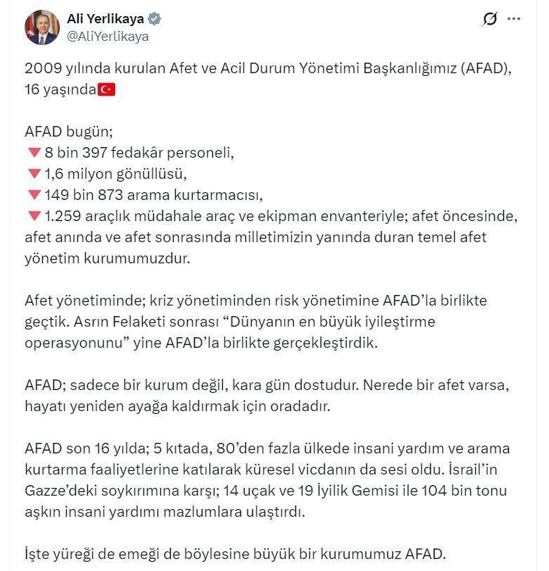 Bakan Yerlikaya, Afet ve Acil Durum Yönetimi Başkanlığı'nın (AFAD) 16'ncı kuruluş yıl dönümü dolayısıyla sosyal medya hesabından açıklama yaptı. Yerlikaya, 2009 yılında kurulan AFAD'ın bugün 16 yaşında olduğunu belirterek, "AFAD bugün; 8 bin 397 fedakar personeli, 1,6 milyon gönüllüsü, 149 bin 873 arama kurtarmacısı, 1259 araçlık müdahale araç ve ekipman envanteriyle; afet öncesinde, afet anında ve afet sonrasında milletimizin yanında duran temel afet yönetim kurumumuzdur. Afet yönetiminde; kriz yönetiminden risk yönetimine AFAD'la birlikte geçtik. Asrın Felaketi sonrası 'Dünyanın en büyük iyileştirme operasyonunu' yine AFAD’la birlikte gerçekleştirdik" dedi.