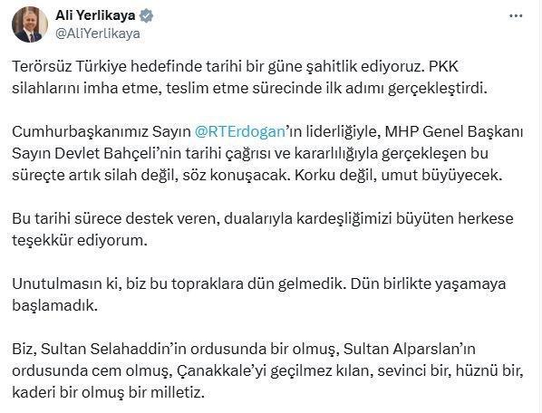 ANKARA, (DHA)- İÇİŞLERİ Bakanı Ali Yerlikaya, terör örgütü PKK'nın silah bırakma sürecine ilişkin, "Cumhurbaşkanımız Sayın Recep Tayyip Erdoğan'ın liderliğiyle, MHP Genel Başkanı Sayın Devlet Bahçeli'nin tarihi çağrısı ve kararlılığıyla gerçekleşen bu süreçte artık silah değil, söz konuşacak. Korku değil, umut büyüyecek" dedi.
